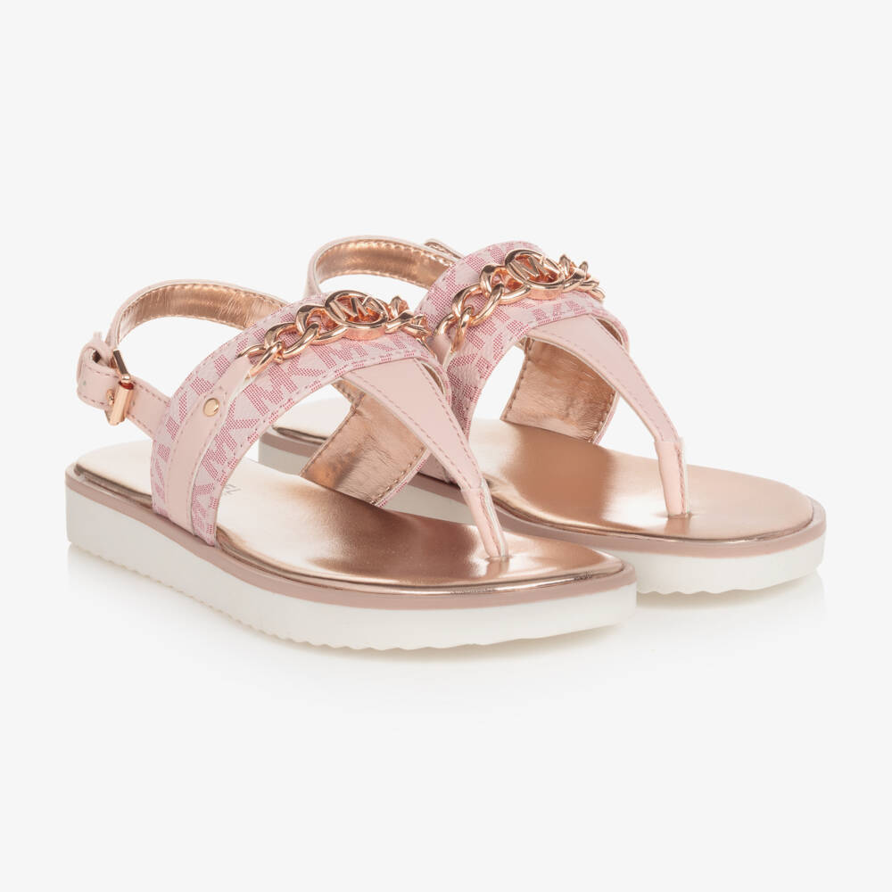 Pretty pink sandals for girls by Michael Kors. Made in soft faux leather, they have a toe post and buckle-fastening back strap. The strap across the foot is patterned with dark pink 'MK' logos and has a rose gold chain on the front with an 'MK logo in the middle for a discreet designer touch. The inner soles are lightly padded for comfort and they have non-slip rubber outer soles.