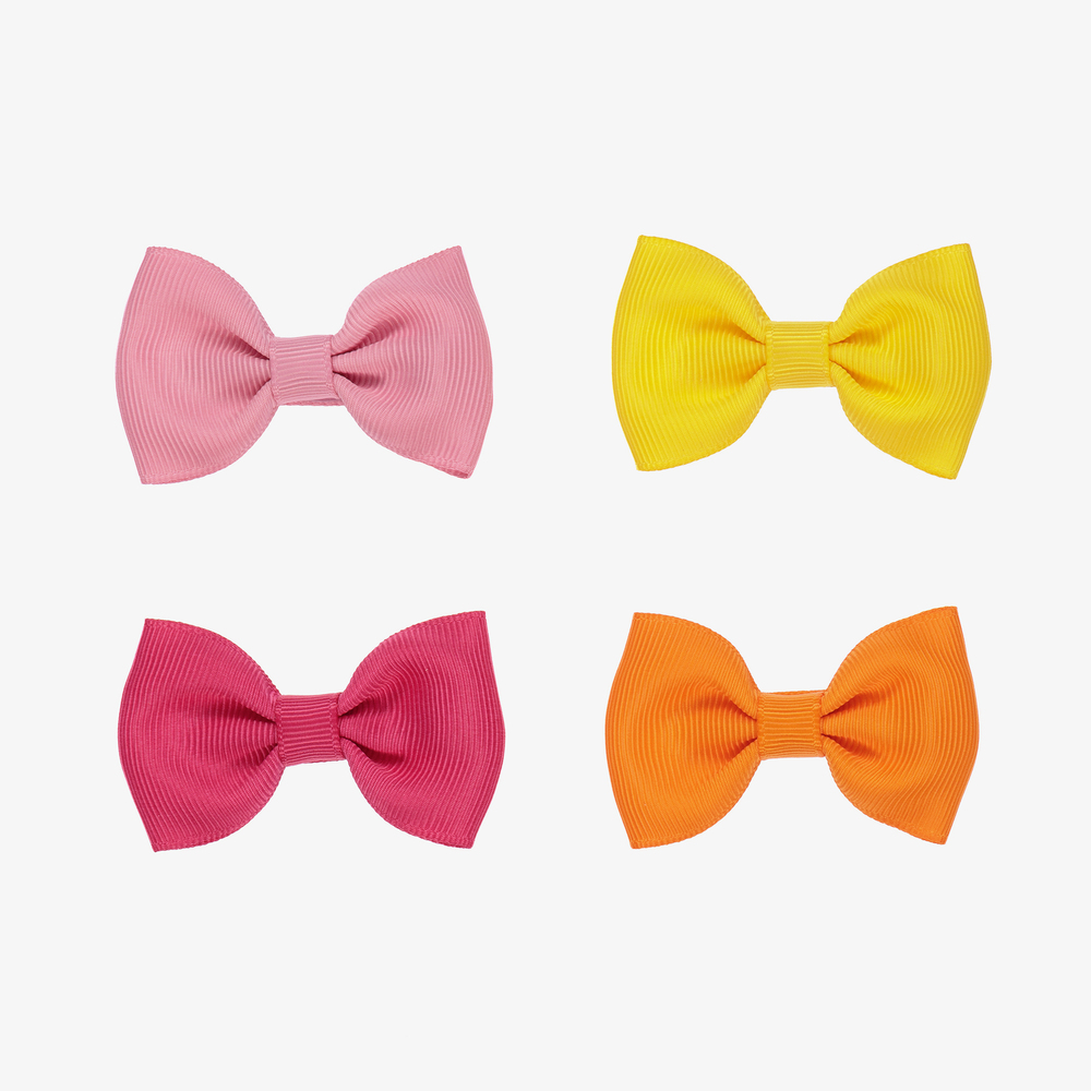 Girls pack of four hair clips by Milledeux. The bows are made in soft grosgrain ribbon in a variety of gorgeous colours, including two pinks, orange and yellow. Each hair accessory secures with a small metal clip.