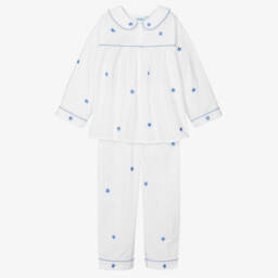 Girls pale blue long pyjamas by Mini Lunn, made in lightweight cotton, with pretty white lace trims. The top has short cap sleeves, with pintuck details and button fastenings on the front. The matching trousers have a drawstring waist for a comfortable fit.