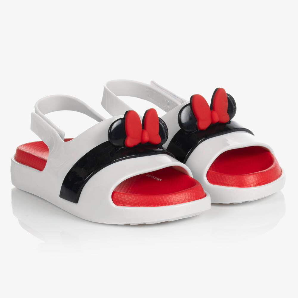 Girls Mini-Disney Cloud sandals by Mini Melissa. These cute off-white shoes have open toes and a velcro closing ankle strap, with a Disney Minnie Mouse bow and ears across the footstrap. Flexible and comfortable, they are made in sweet-scented Melflex® PVC, with a moulded footbed. They have a cushioned inner sole and a non-slip outer sole for grip.