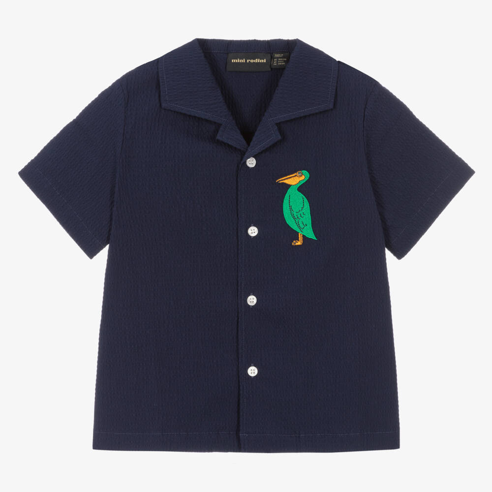 A navy blue shirt for boys by Mini Rodini, made in soft organic cotton seersucker. This cool shirt has a relaxed revere collar and pearlescent button fastenings. A green pelican bird is embroidered on the chest for a fun finish.