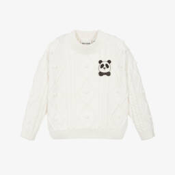 Navy blue half-zip sweater for boys by Mini Rodini, made in a soft, chunky organic cotton knit. Warm and cosy, this casual style has a stand-up collar with a half-zip fastening and a cute panda appliqué on the chest for instant brand recognition and a playful touch.