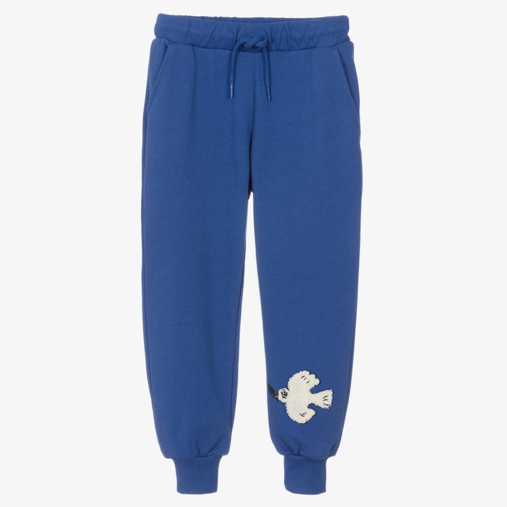 Bright blue joggers for boys and girls by Mini Rodini, made in super soft organic cotton jersey. In collaboration with Wrangler, they have an ivory dove appliqué on one leg for a fun yet casual look. There is a drawstring waist for a great fit, side pockets and cuffed ankles.