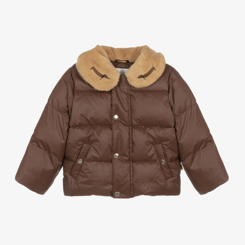 From Mini Rodini, brown puffer jacket for boys and girls, with a fun faux fur collar. Ideal for cooler days, this silky smooth jacket is made in breathable, water-resistant and windproof fabric with light padding for added warmth. It fastens with complementary matte gold-tone zip and popper fastenings on the front and is finished with cute embroidered dogs on the collar. This item contains recycled materials.