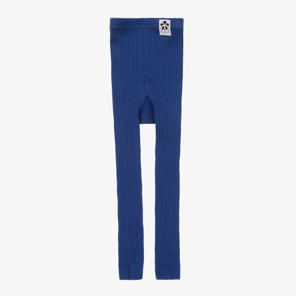 Blue leggings for girls by Swedish brand Mini Rodini, knitted in soft organic cotton. Lightly ribbed and stretchy for comfort, these they are ideal for layering under skirts, dresses and tunic tops. A panda logo patch is featured on the elasticated waistband for a quirky finishing touch.