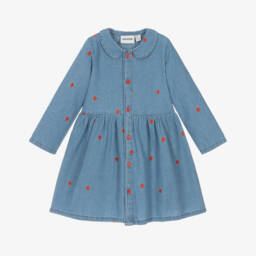 For girls from Mini Rodini, a green velour dress made from organic cotton. A modern twist on a sailor dress, this lovely dress has double-breasted popper fastenings on the front and ivory trim detailing.