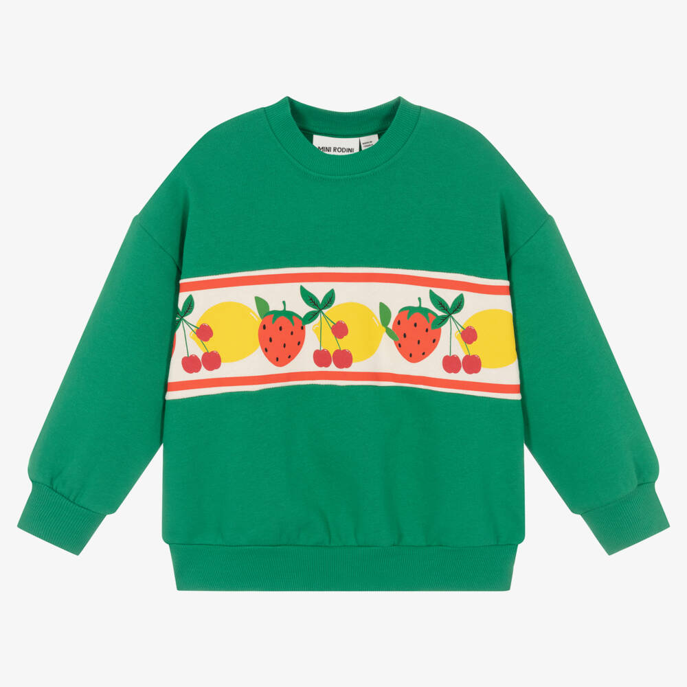 A casual green sweatshirt for boys and girls by Mini Rodini, made from super soft organic cotton jersey. In a cool retro style, this top has an ivory panel on the front, printed in a variety of delicious fruits - including strawberries, cherries and lemons.