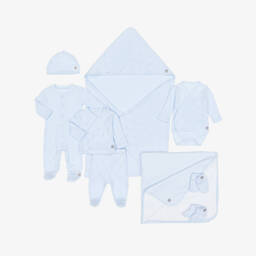 Pale blue blanket and hat set for baby boys and girls from Minutus. Made in beautifully soft cotton jersey, this versatile set is an ideal addition to the hospital bag. The blanket has fluffy and absorbent towelling on the reverse side, cosy and snuggly for mummy and baby's first skin-to-skin moment. It can also be used as a soft surface to lay baby on after bathtime. The layette hat has a turned-up brim and is made in soft jersey for gentle comfort on delicate skin.