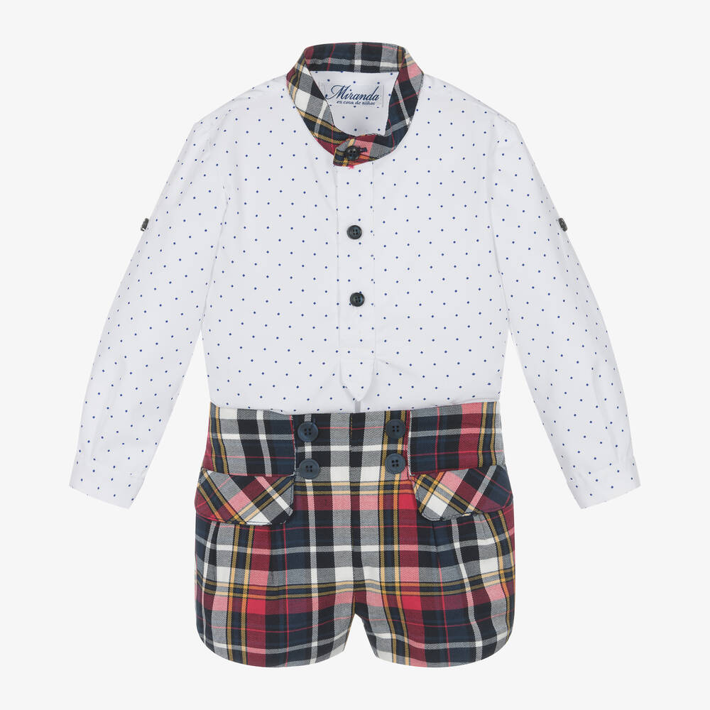 A navy blue tartan shorts set for younger boys by Spanish brand Miranda, made in soft and lightweight cotton. With a little blue dot pattern, the white shirt has a tartan trim, a button fastening front and for an adjustable length, there are button tabs on the long sleeves. Completing the traditional look, the tartan shorts have decorative pockets and buttons on the front. They are fully lined in soft voile with a partly elasticated waistband for a quick pull-on.