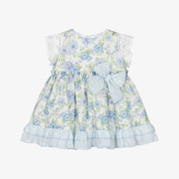 A lovely navy blue dress for girls by Spanish brand Miranda, made in a soft cotton and viscose blend. It is patterned in a red and white checked design, with a silver thread woven throughout adding a subtle shimmer. It has a flared skirt, red tulle trims, faux pockets and a logo charm decorating the waist for a pretty finish. Fully lined in lightweight voile for comfort, the dress fastens neatly on the back with a concealed zip.