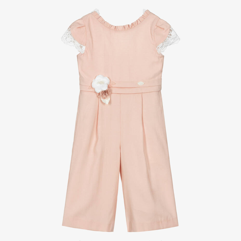 Girls lovely and feminine rose pink jumpsuit by Spanish brand, Miranda. Made in a soft viscose blend crêpe, this stylish one-piece has white lace detailing on the back and shoulders. There is a popper removable flower corsage at the waist and the trousers have a flared cut. There is a back zip fastening and it is half-lined in a soft cotton blend fabric.