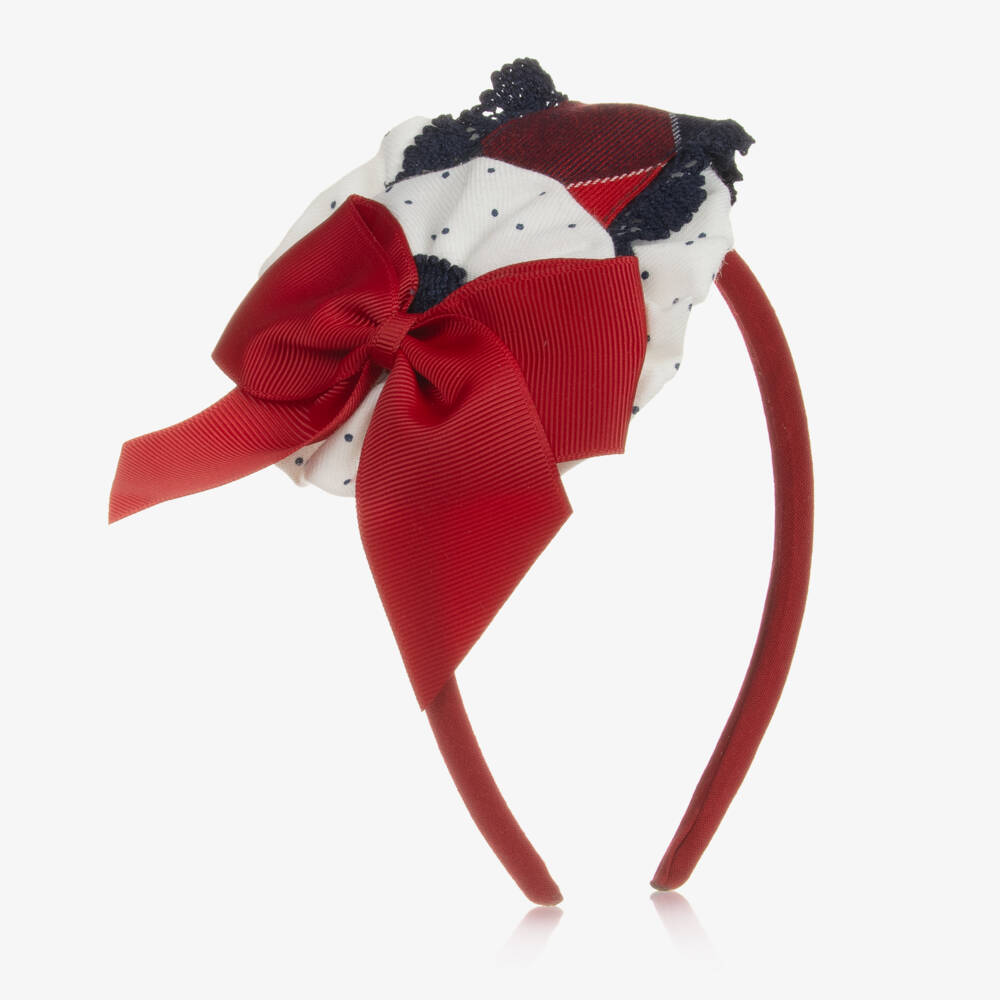 Classically styled red hairband for girls by Spanish brand Miranda. The flexible, fabric-covered band is topped with a removable rosette which is decorated with a red grosgrain bow and tartan trim. Included is a silver-tone crocodile clip, meaning the rosette can be worn in the hair separately for an alternative look.