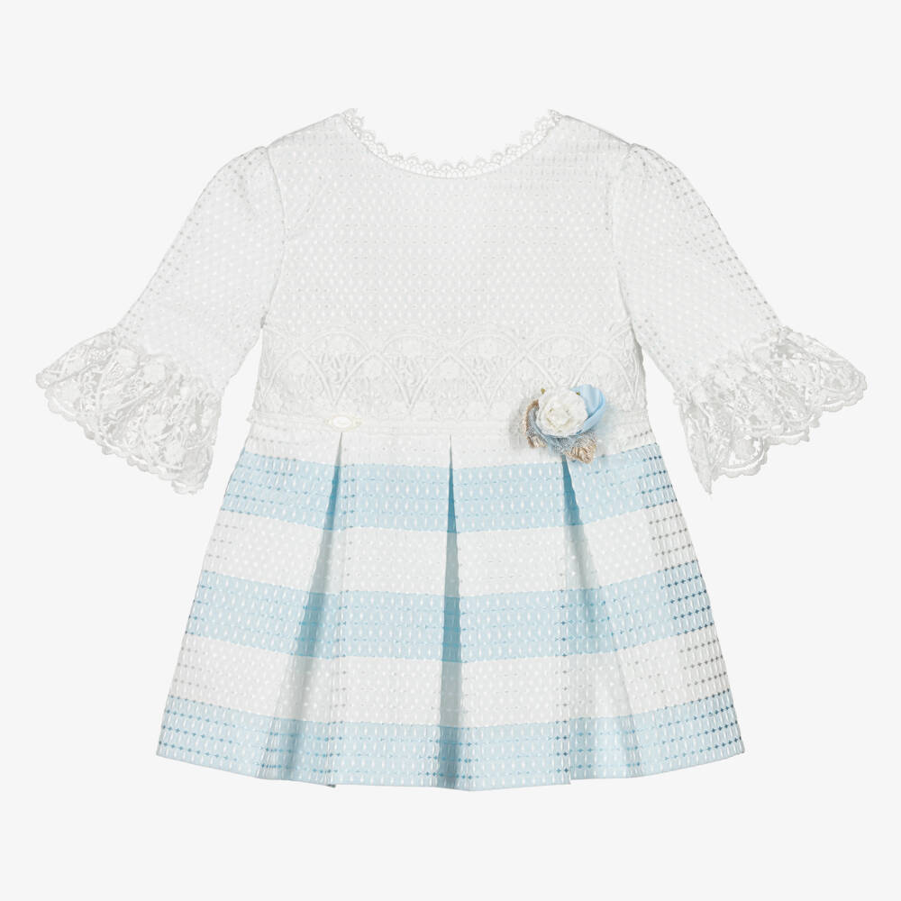 Girls lovely white and blue striped dress by Spanish brand, Miranda. Woven in soft jacquard with a diamond-patterned sheen, there is a beautiful lace trim on the bodice and three-quarter length cuffs with matching lace ruffles. The waist is decorated with a popper removable floral corsage. The pleated skirt is striped and the dress fastens on the V-shaped back with a concealed zip and removable popper bow. It is fully lined in a soft cotton blend.