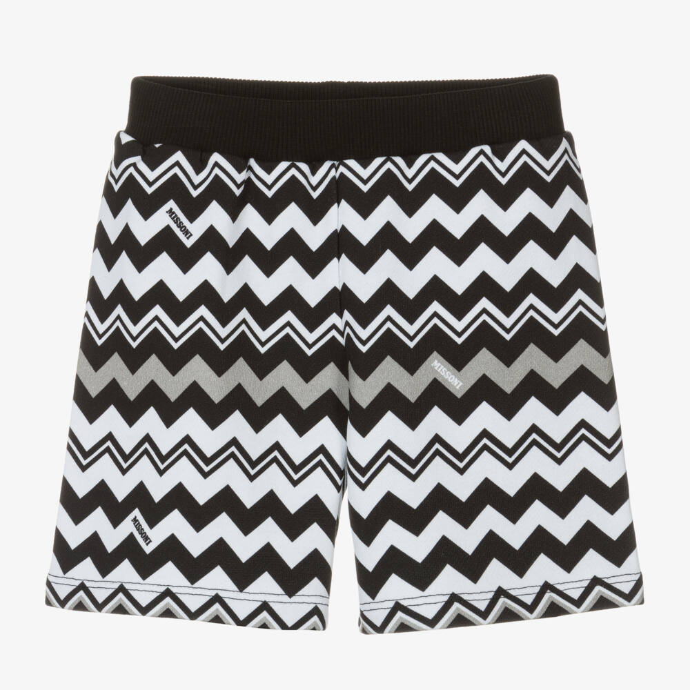 Black and white shorts for baby boys by luxury Italian designer Missoni, made from soft organic cotton jersey. Designed in the iconic Zigzag print, these casual shorts have an elasticated waist for a comfortable fit on tiny tummies. The brand's name can be seen within the print, along with a complementary shade of grey.