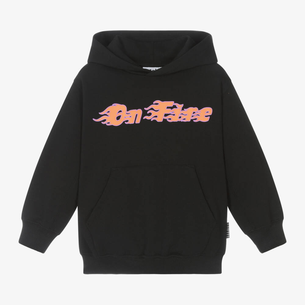 A casual black hoodie for boys and girls by Molo, made from soft organic cotton jersey. Cool to wear on casual days, it has an orange and purple 'On Fire' slogan and a pouch pocket on the front.