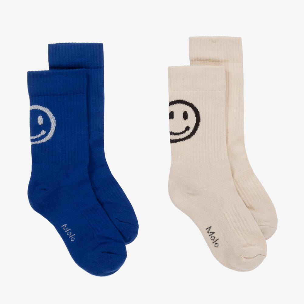 Two pairs of lightly ribbed socks for boys and girls by Molo, made in a soft and stretchy cotton blend. One pair is in cobalt blue with a white happy face motif on the ankle. The other is in light beige with a matching design in black.