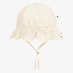 Aqua blue UPF50+ sun hat for younger boys by Molo, patterned with adorable turtles. Made from stretchy recycled fabric in a Legionnaire's style, it has a peak to shield the eyes, a flap to protect the neck and ties to fasten under the chin for a secure fit.
