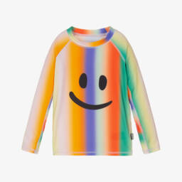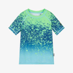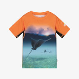 Cool beige and turquoise green UPF50+ swim top for boys by Molo, with a print of surf boards on the beach. Made in lightweight, silky smooth jersey, it has overstitch detailing and is easy to wear, simply pulling on.