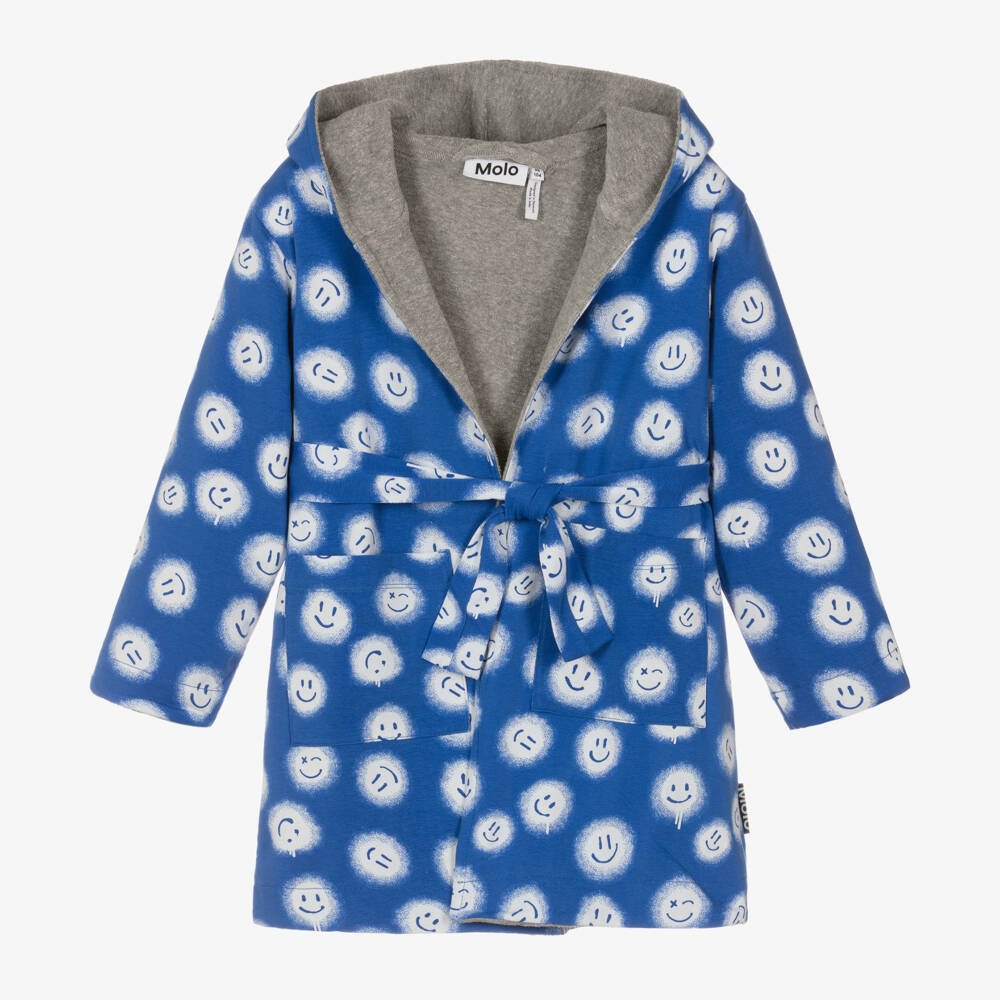 Blue cotton dressing gown for boys by Danish brand Molo, with a white, painted-effect, happy face print. Made in comfortable jersey, it is lined in absorbent grey towelling, ideal for wearing after bath time. It has a cosy hood, a detachable sash belt and useful patch pockets on the front.