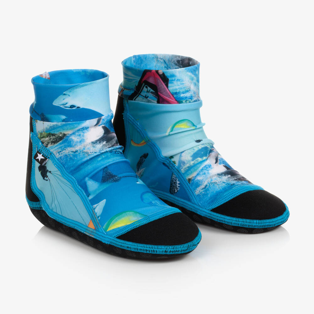 Boys aqua shoes by Molo, in a colourful ocean themed print with black trims and blue stitching. Easy to pull-on, they are made from soft and stretchy recycled fabric, with lightly padded heels, toes and non-slip soles.
