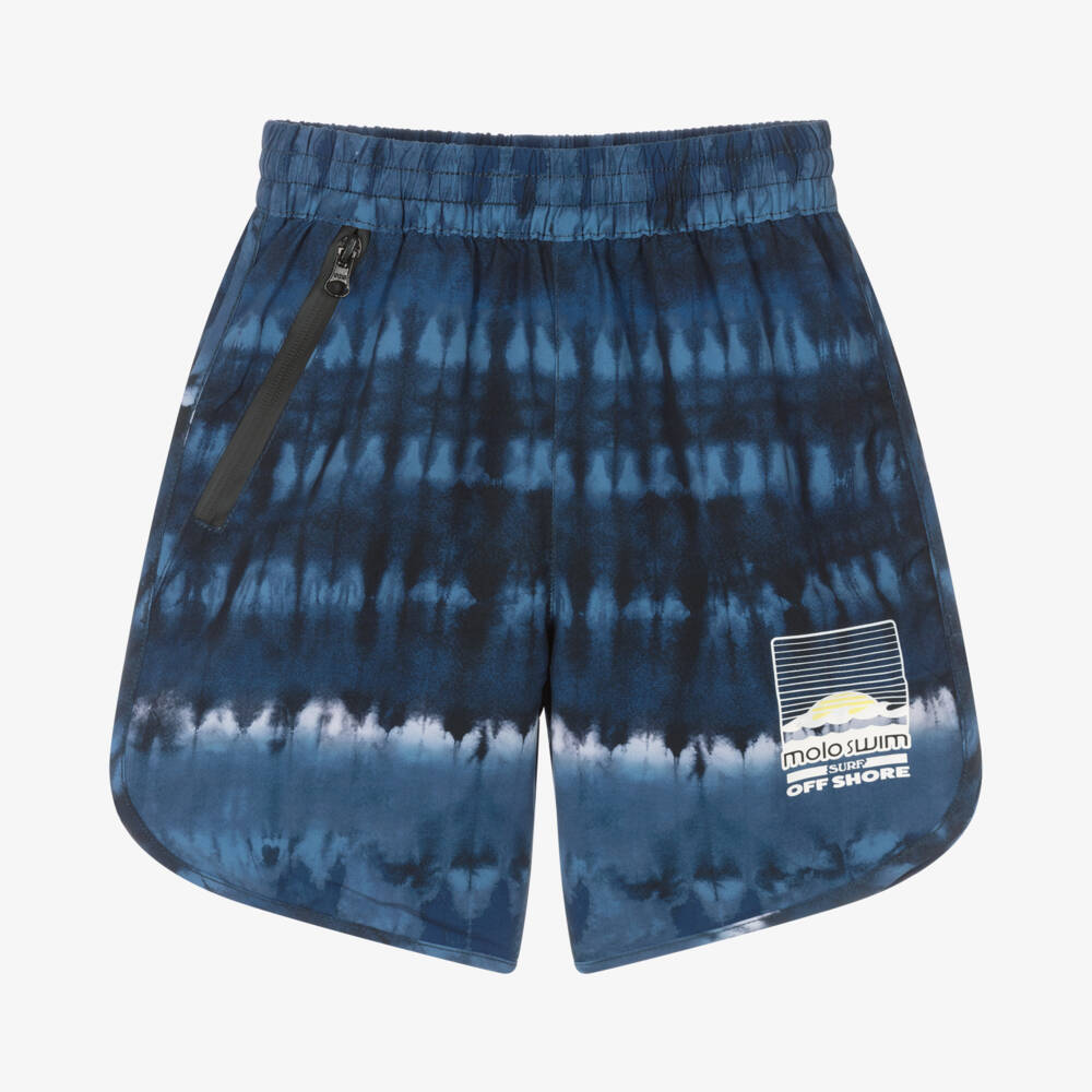 Dark blue swim shorts for boys from Danish brand Molo, with a tie-dye pattern and a UPF 50+. Silky smooth and lined with soft mesh for added comfort, they have an elasticated waist that can be adjusted with an internal drawstring for a better fit. They have a useful pocket on the front which fastens with a zip for added security.