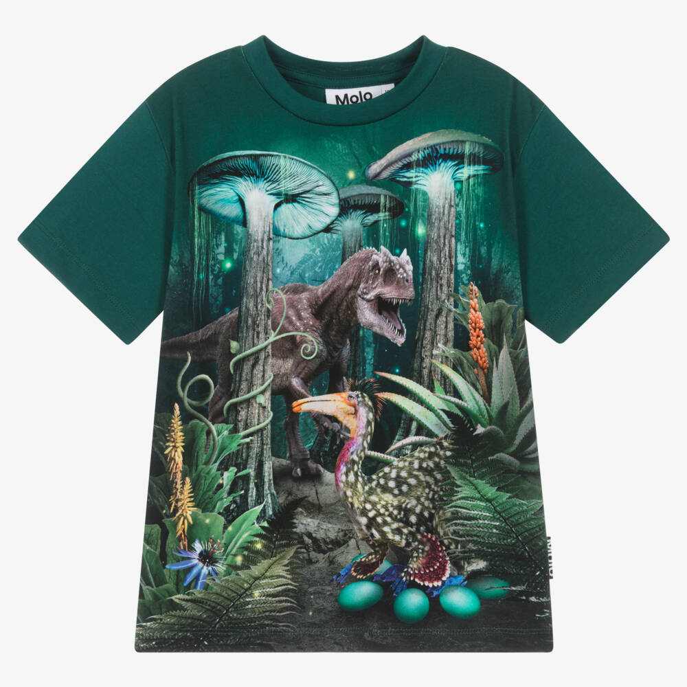 Dark green T-shirt for boys by Danish brand Molo, made in soft organic cotton jersey. Designed to capture the imagination, it has a bird-like dinosaur print with mushroom trees and fireflies in the forest. It has a rounded neckline, short sleeves and a logo tab on the side seam.