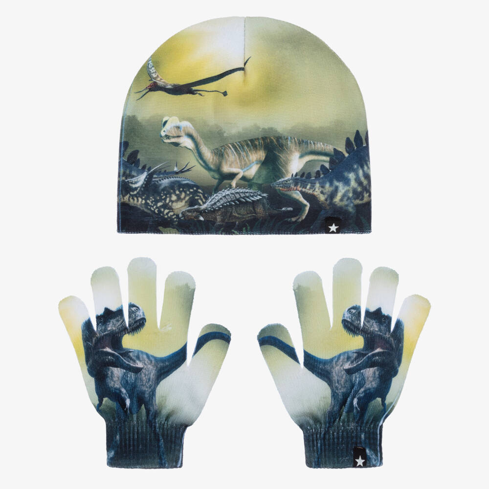 Green hat and gloves set for boys by Molo, made in a super soft polyester jersey. Great for co-ordination, both pieces are matching, with a fun dinosaur print.
