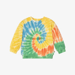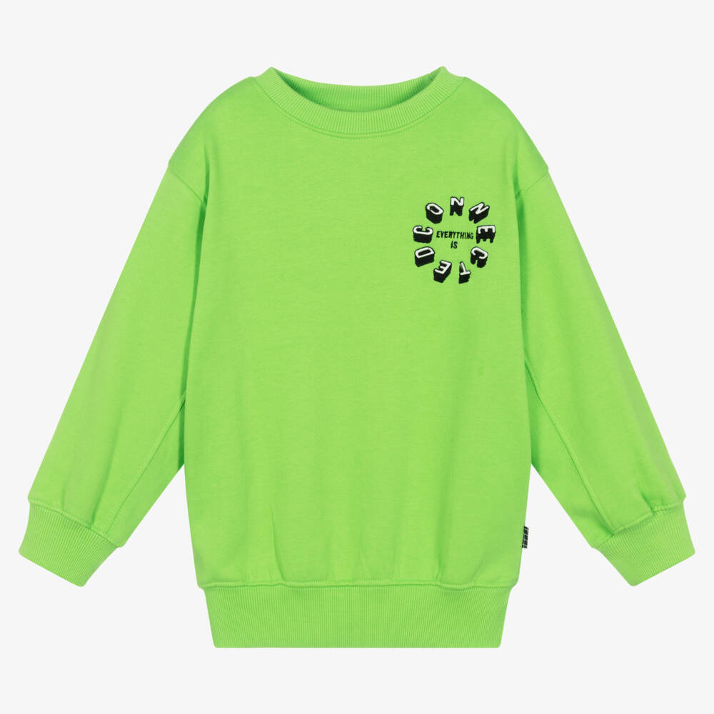 Vibrant green sweatshirt for boys by Danish brand Molo, made from soft organic cotton jersey. Fun and urban, this top has a black and white slogan embroidered on the chest with a three-dimensional effect. It has an oversized fit and dropped shoulders for a laid-back finish.