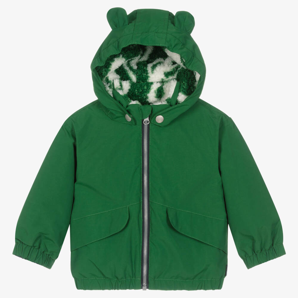 Green waterproof nylon jacket for little boys by Danish brand Molo. With lightweight recycled padding, this functional jacket has useful front flap pockets and elasticated trims to keep the warmth in. The detachable hood has cute 3-D ears and a recycled, super-snuggly, green and teddy fleece lining with smiling white faces, which extends to the upper part of the coat as well. It is secured with silver logo poppers. There is a rubberised logo tab on one side seam, a large reflective star printed on the back and a silky, navy blue lining on the lower part. The front zip fastening has a protective chin guard.