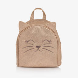 A brown backpack for boys and girls by Molo, made from durable canvas. Printed with a cute and colourful teddy bear pattern, it has beige trims on the adjustable straps and a supportive clip fastening. The spacious zip-up main compartment has soft twill lining, a handy zipped pocket on the front, and a useful top handle for hanging on a hook.