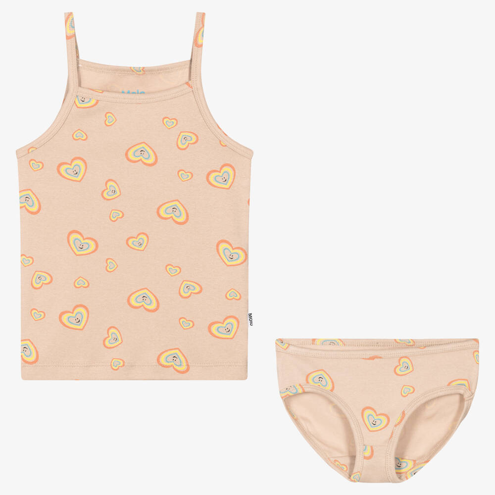 A vest top and knickers set for girls from Danish label Molo, in deep beige. Patterned with smiling hearts, this cute matching set is made in super-soft and lightweight organic cotton for lasting comfort. The top has narrow shoulder straps and a logo tab and the knickers have a gentle-on-the-skin stretchy waist.