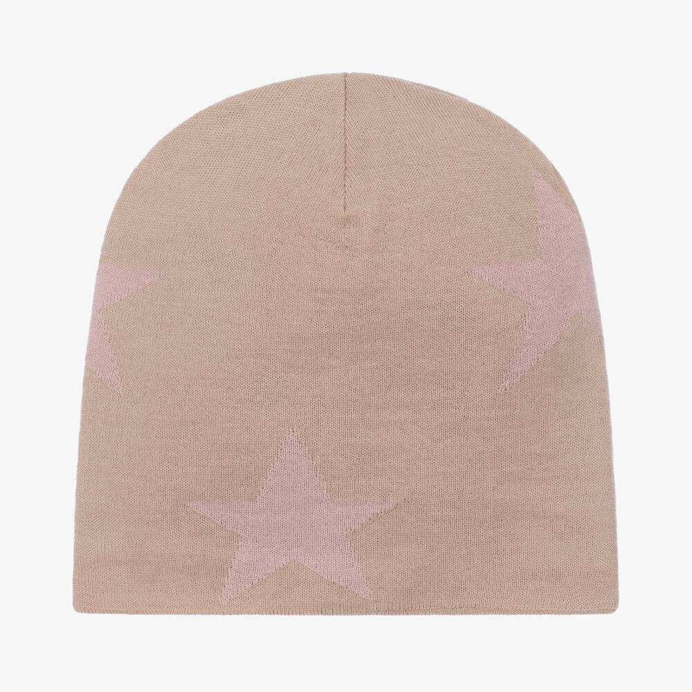 Girls beige wool hat by Danish brand Molo, knitted from a super soft wool acrylic blend. Lined with warm grey fleece, it has a cute pink star pattern.
