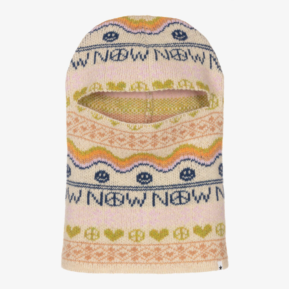Positive vibes are the theme of this beige knitted balaclava for girls by Molo. Soft and cosy, it is made in a chunky wool blend for warmth. Knitted amongst the Fair Isle pattern are happy faces, peace signs and wavy lines in soft tones of blue, pink and green.