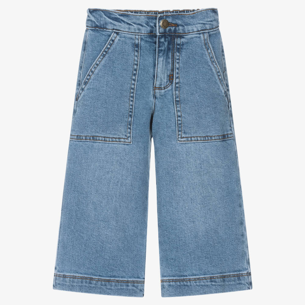 Blue denim jeans for girls by Molo, made in a soft and stretchy organic cotton blend. These stylish wide-leg jeans have a super relaxed fit, with large patch pockets on the front and back. Fastening with a popper and zip, they have an elasticated waistband for a comfortable fit. A brown logo badge finishes the back.