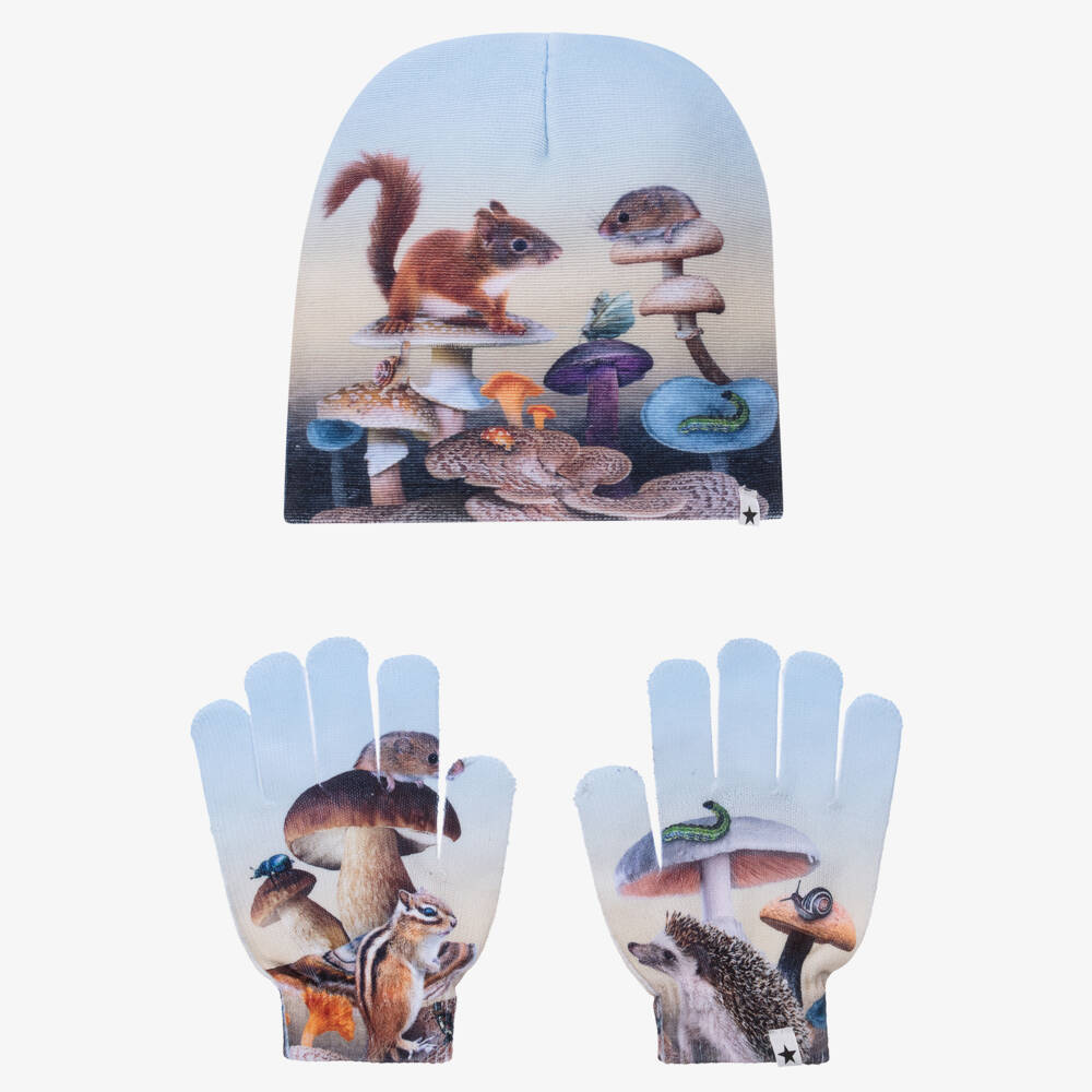 Pale blue beanie hat and gloves set for girls by Danish brand Molo. Made in soft, stretchy and medium-weight jersey, both pieces are patterned with cute mushroom and woodland creature graphics.