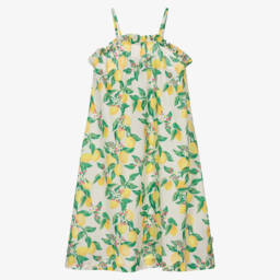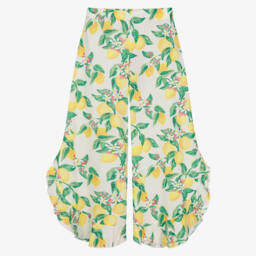 Patterned in colourful painted tropical fruits, these wide-leg ivory trousers for girls are by Molo. Woven in soft and lightweight organic cotton, they are the ideal cover up at the beach or poolside. The waist is partly elasticated for comfort, and the hems are trimmed with pretty flounces.
