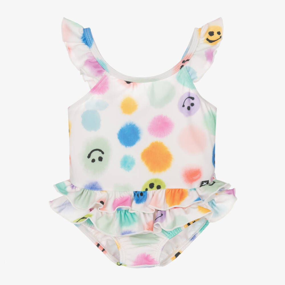 Super cute, this ivory UPF50+ swimsuit for little girls is by Molo. Soft with partial lightweight lining, it is printed with a fun and colourful watercolour dot pattern featuring adorable happy faces. There are pretty frilled trims on the straps and around the waist for a sweet finish. The fabric is made using recycled fibres for a positive eco impact, with UPF50+.