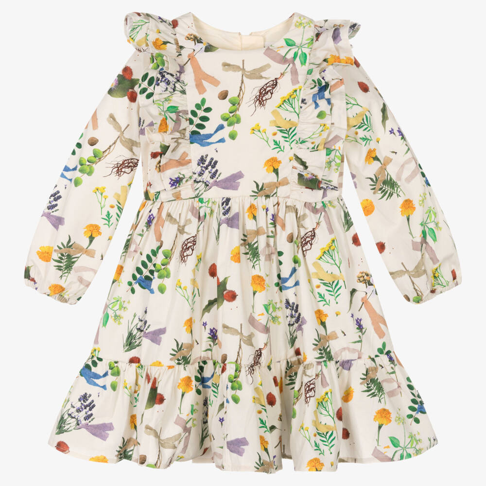 A pretty ivory dress for girls by Danish brand Molo, made from lightweight organic cotton poplin. Meadow-inspired, this long-sleeved dress is designed in an all-over print, featuring colourful flowers and berries. It is constructed with a tiered skirt, a back zip fastening and layered ruffle trims on the bodice that run up and over the shoulders.