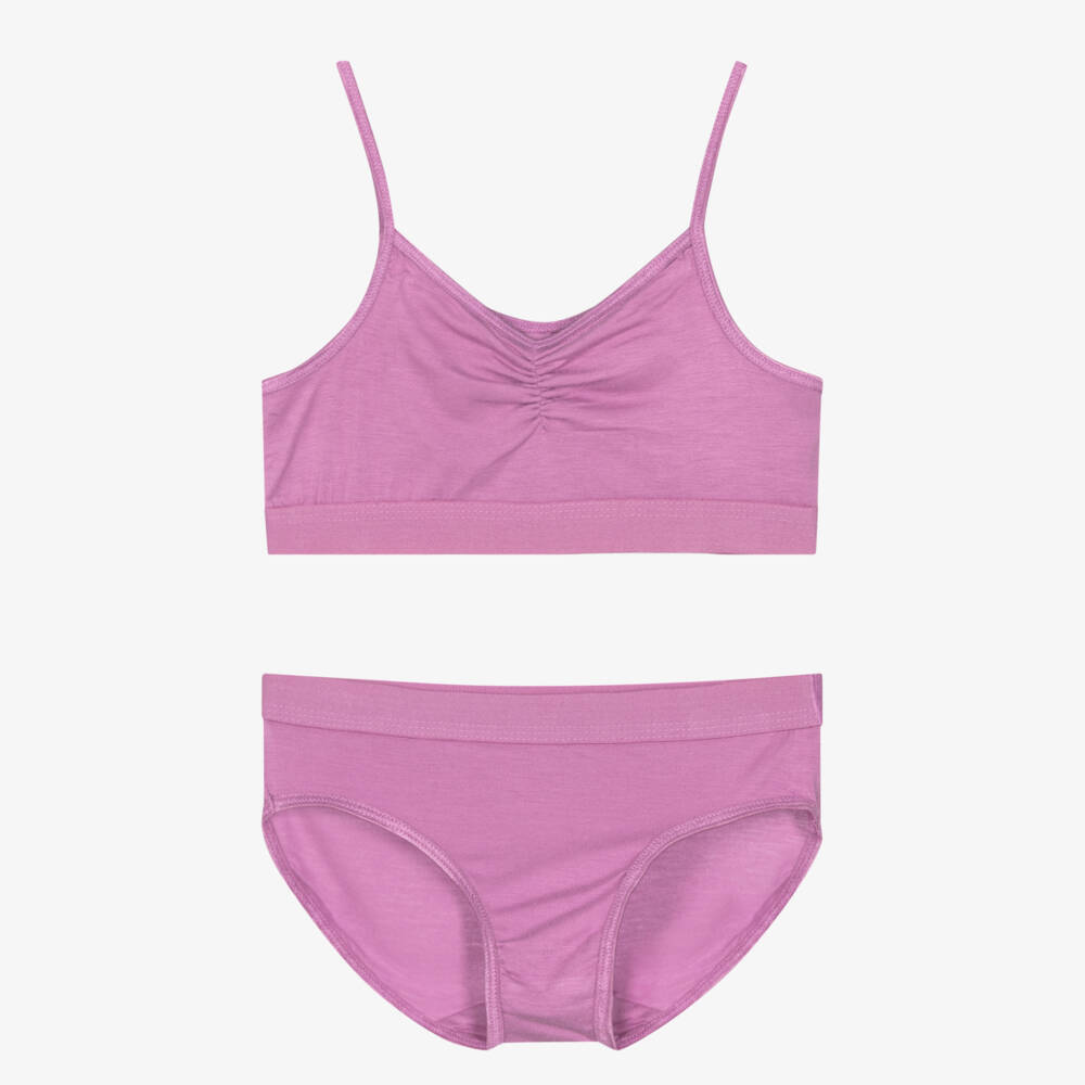 A bra top and knickers set for girls from Danish label Molo, in mauve purple. This cute matching set is made in super-soft and lightweight viscose jersey for comfortable wear. The top has narrow shoulder straps, a ruched detail on the front and an elasticated hem for the ideal fit. The knickers have a gentle-on-the-skin elasticated waist. These items contain sustainable Lenzing EcoVero fibres.