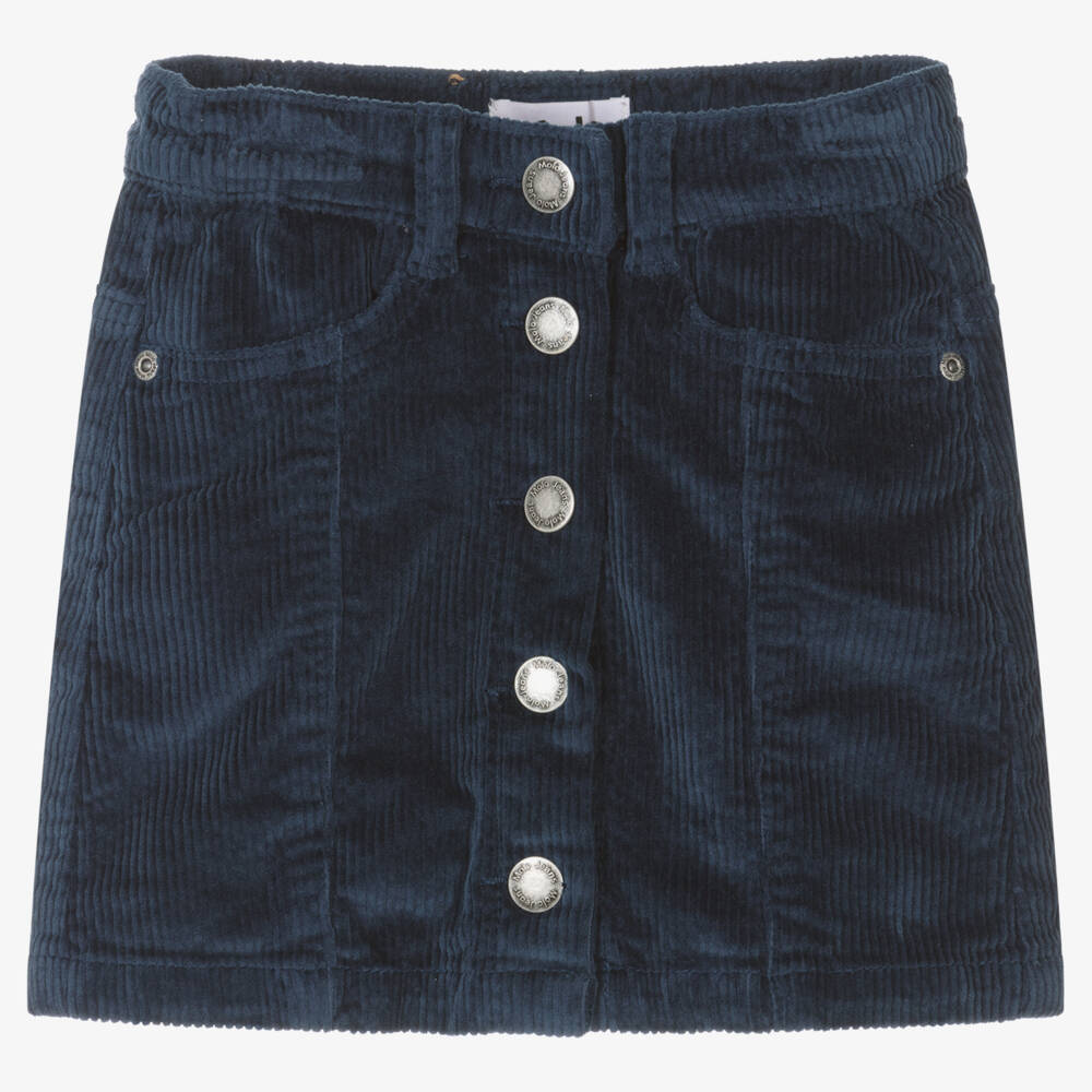 Navy blue skirt for girls by Danish brand Molo, made from soft cotton corduroy with added stretch. Great for pairing with tops and blouses, this casual skirt is designed with front pockets, belt loops and logo-embossed rivets. It fastens with branded poppers at the top and has an adjustable waistband to ensure a good fit. The logo badge on the back of the waist adds a final designer touch.