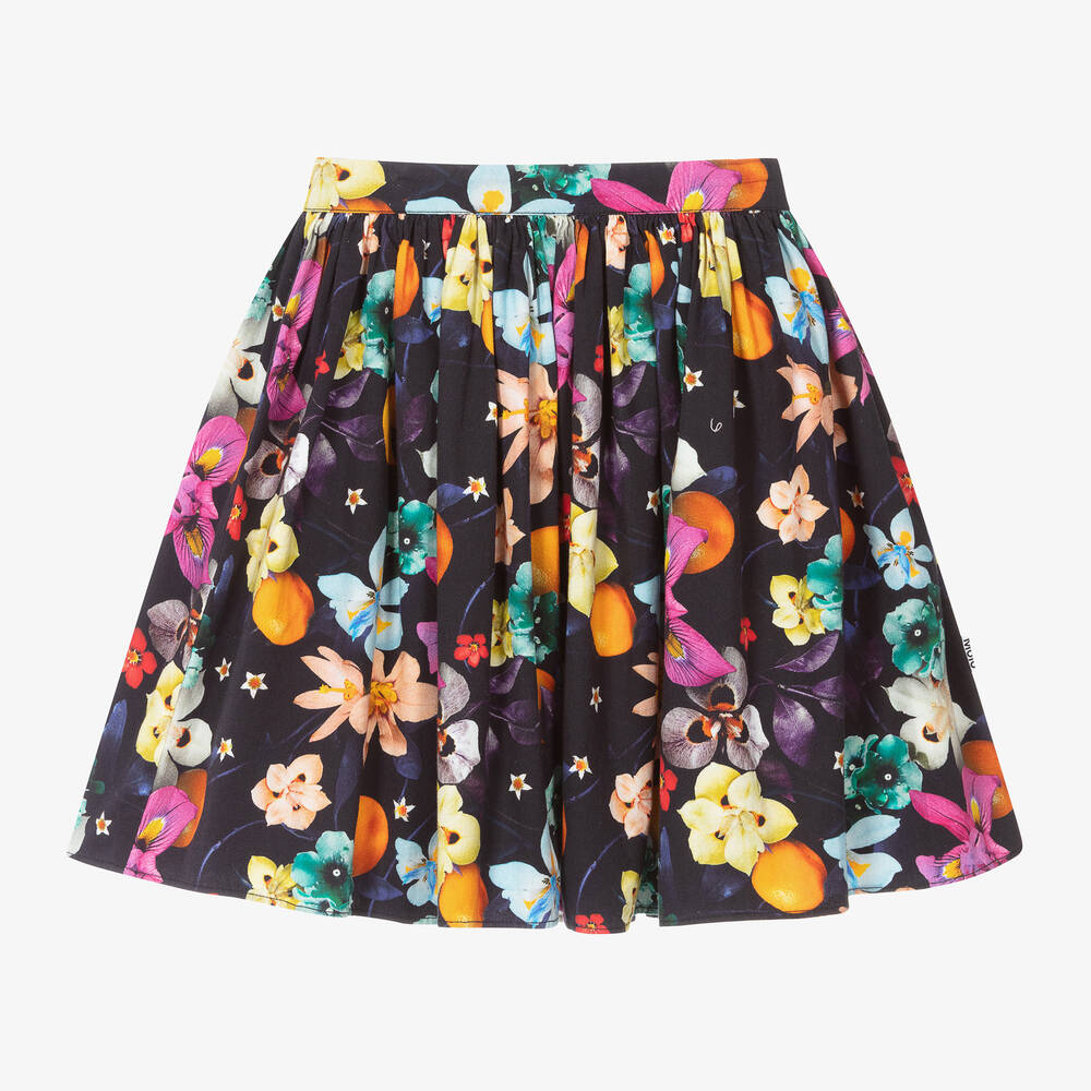 Navy blue floral skirt for girls from Molo, with a beautiful orchid print. This skater-style skirt is made of soft, brushed cotton and is designed with a part-elasticated waist for no-fuss dressing.
