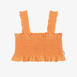 This vibrant orange sleeveless top for girls by Molo, is a lovely choice for warm, summer days. A comfortable, fitted style, it is made in soft cotton, with gentle shirring on the shoulder straps and around the bodice. A small logo tab offers designer appeal, while ruffle trims add a pretty finishing touch.