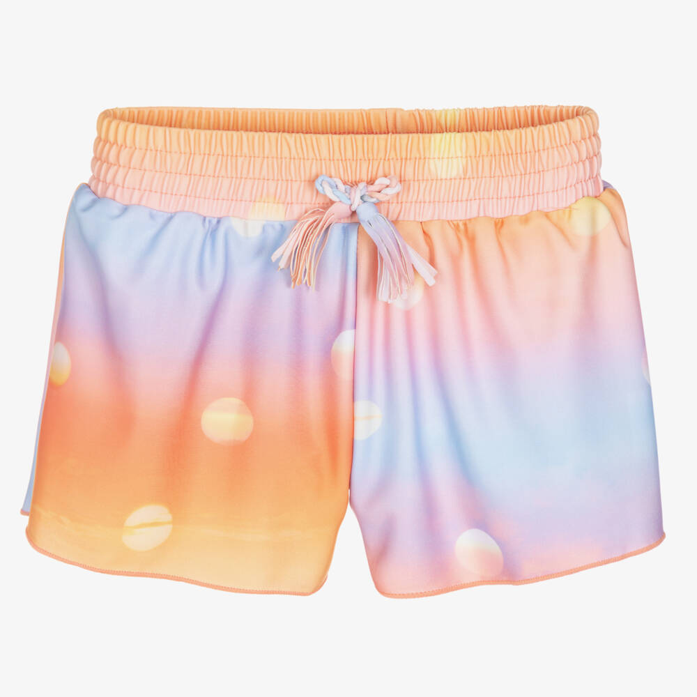 Orange swim shorts for girls from Danish brand Molo, with UPF 50+. Ideal for use at the beach or in the pool, they are silky smooth and stretchy with a lightweight knicker lining for added comfort. They are printed with hues of blue and silhouettes of the sun for an eye-catching look and have a decorative drawstring on the waist.