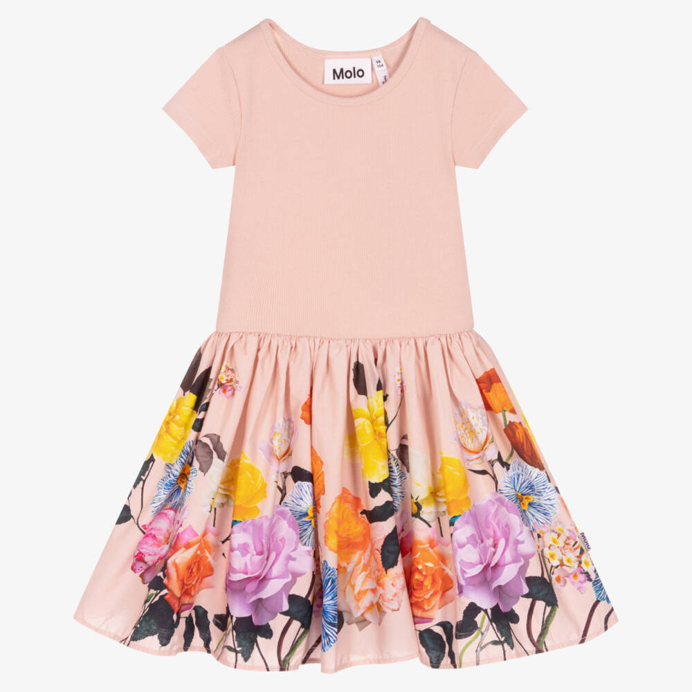 Girls beige-pink dress by Molo, made in organic cotton. Cool and casual, this dress has a soft ribbed jersey bodice with capped sleeves and a smooth poplin skirt, patterned with a vibrant floral print in hues of pink, blue and orange for a pretty finish.