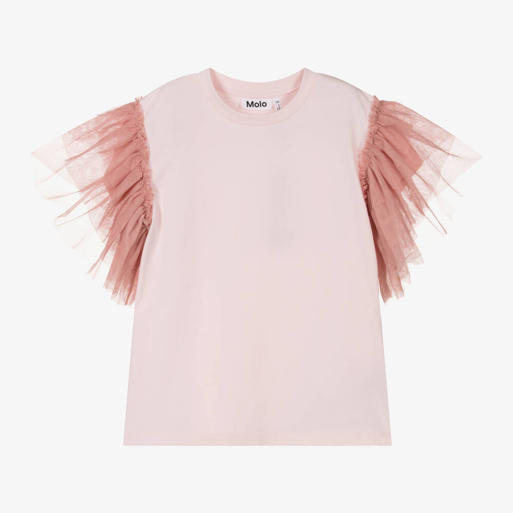 Pale pink cotton T-shirt for girls by Molo. Made in soft jersey, this casual design has short sleeves overlayed with soft gathered tulle for a stylish finish.