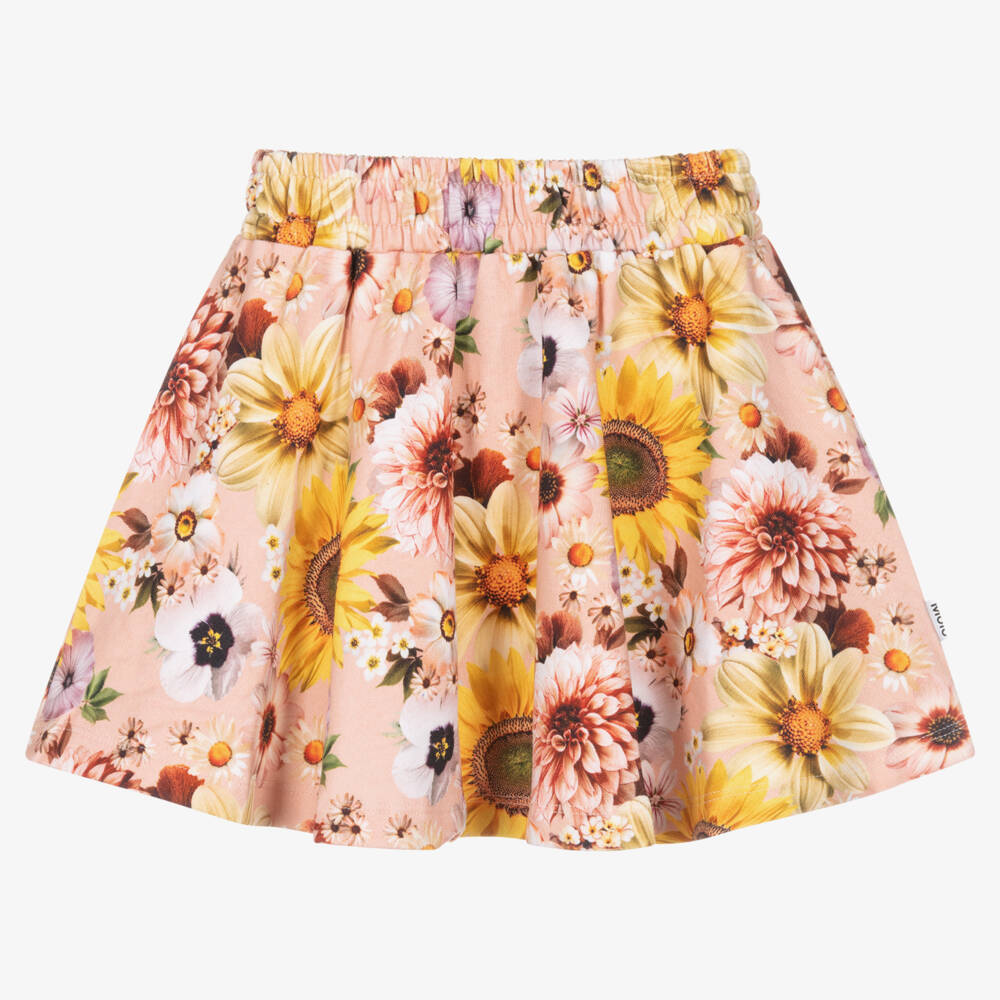 Coral-pink and yellow skirt for girls from Danish label Molo, made in mid-weight organic-cotton jersey. Comfortable and beautifully patterned, the soft, stretchy fabric is decorated with flowers in muted tones. A logo tab is stitched on the side and the waist is softly elasticated, gentle on the skin.