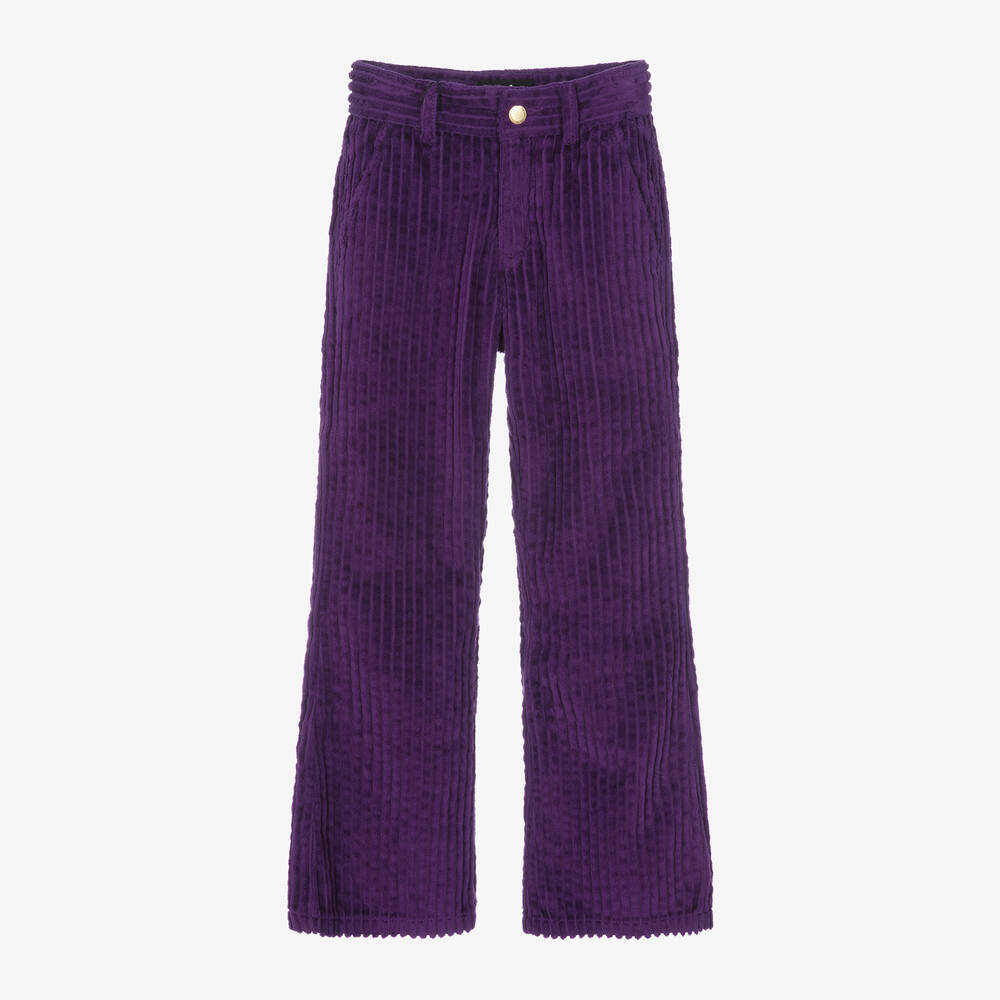 Girls deep purple trousers by Molo, made in soft, jumbo cotton corduroy. Designed in a flared slim fit, these stylish trousers have slanted front pockets and patch pockets on the back. They sit comfortably just below the waist and fasten with a gold-tone logo popper and zip, with an adjustable waistband to ensure a great fit. A branded jacron on the back adds a signature finish.