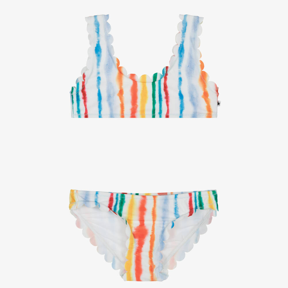 With UPF50+, a white bikini for girls from Molo. Patterned with watercolour-effect rainbow stripes, this lovely two-piece is made in silky, stretchy and recycled fabric, with a full-lining for comfort and scalloped trims for a sweet look. The top has a subtle logo tab on one side seam.