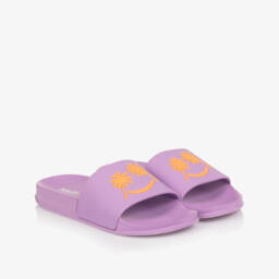 Lilac purple sliders for boys and girls by Molo, featuring a cheerful orange smiling face with palm tree eyes. Casual, comfortable and easy to slip on, they are ideal for the beach or pool, with a moulded footbed and non-slip sole for good grip. The smallest size comes with an elasticated heel strap for a secure fit.