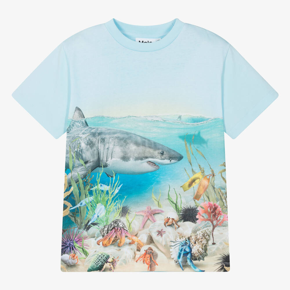 Teen boys light blue short-sleeved T-shirt by Molo, with a striking sea creature graphic print. Cool for streetwear styling, this casual top is made from relaxed organic cotton jersey with a logo tab detailing the seam.